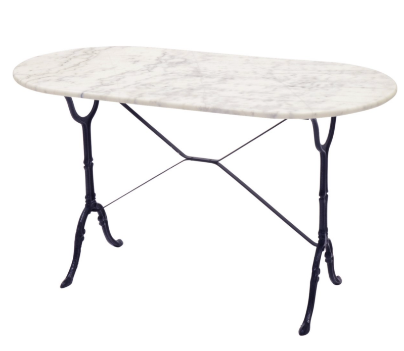 Bistrotafel met ovaal marmeren tafelblad. Het onderstel is gemaakt van gietijzer en het tafelblad van marmer (natuursteen). Het blad heeft een afmeting van 120cm x 60cm en heeft een bladdikte van 2 cm. De tafelhoogte is 71 cm.
